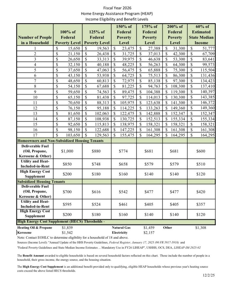 (BOSTON, MA) – The U.S. Department of Health and Human Services has released $3.7 billion to states for the Low Income Heating Assistance Program (LIHEAP), of which Massachusetts will receive more than $146 million. ABCD is accepting and processing Home Energy Assistance Program (HEAP) applications for residents in Greater Boston and the Mystic Valley, and award letters are forthcoming. The maximum benefit for deliverable fuels (oil, propane) is $1,000 and the max for utilities is $850.
